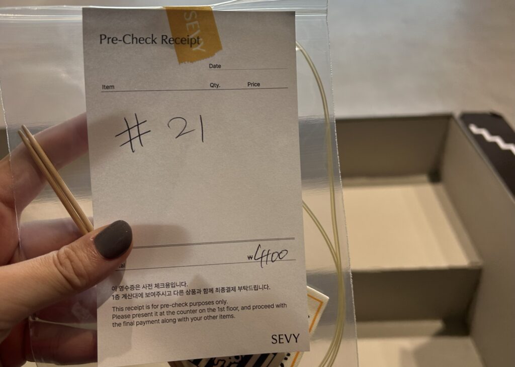 確認が終わると、店員さんがビニール袋に商品をまとめてくださり、メモを貼り付けてくれるので、それを1階のレジに持っていけばOKです。