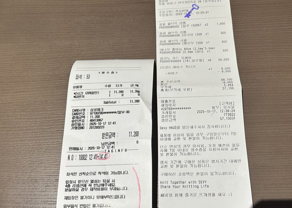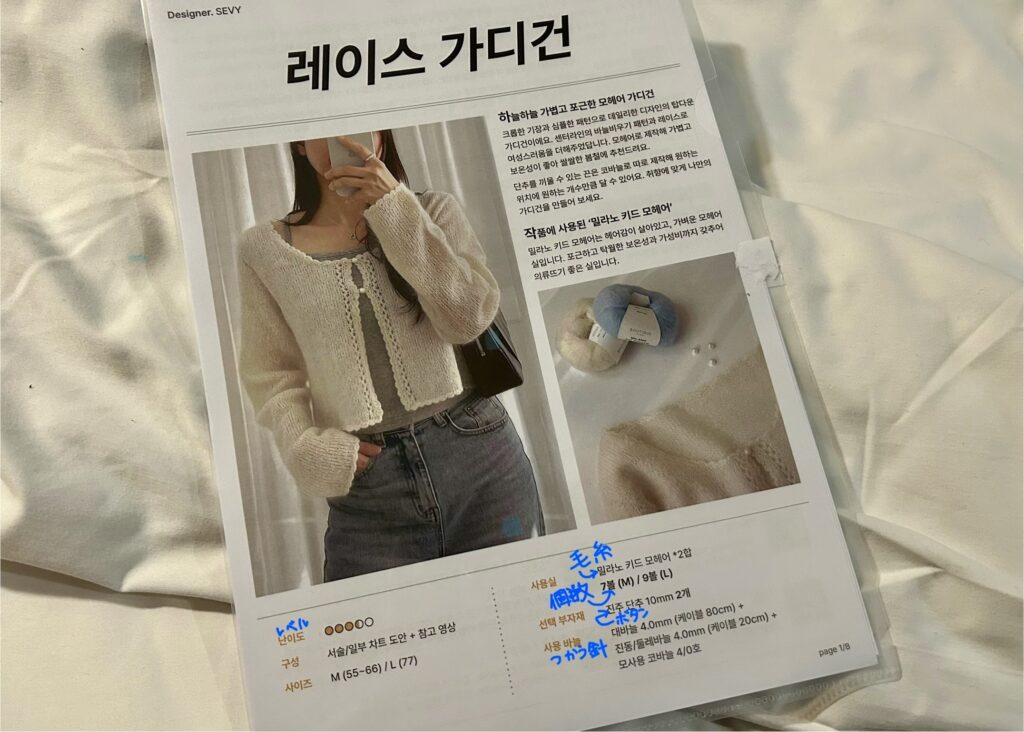 このパターンのお値段は8000ウォンでしたが、着分の毛糸を購入したからか、無料でした!