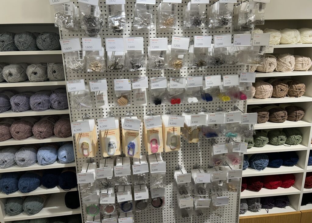 レジ横や壁面にはボタン、タグ等の資材や、ニッティングツールも!