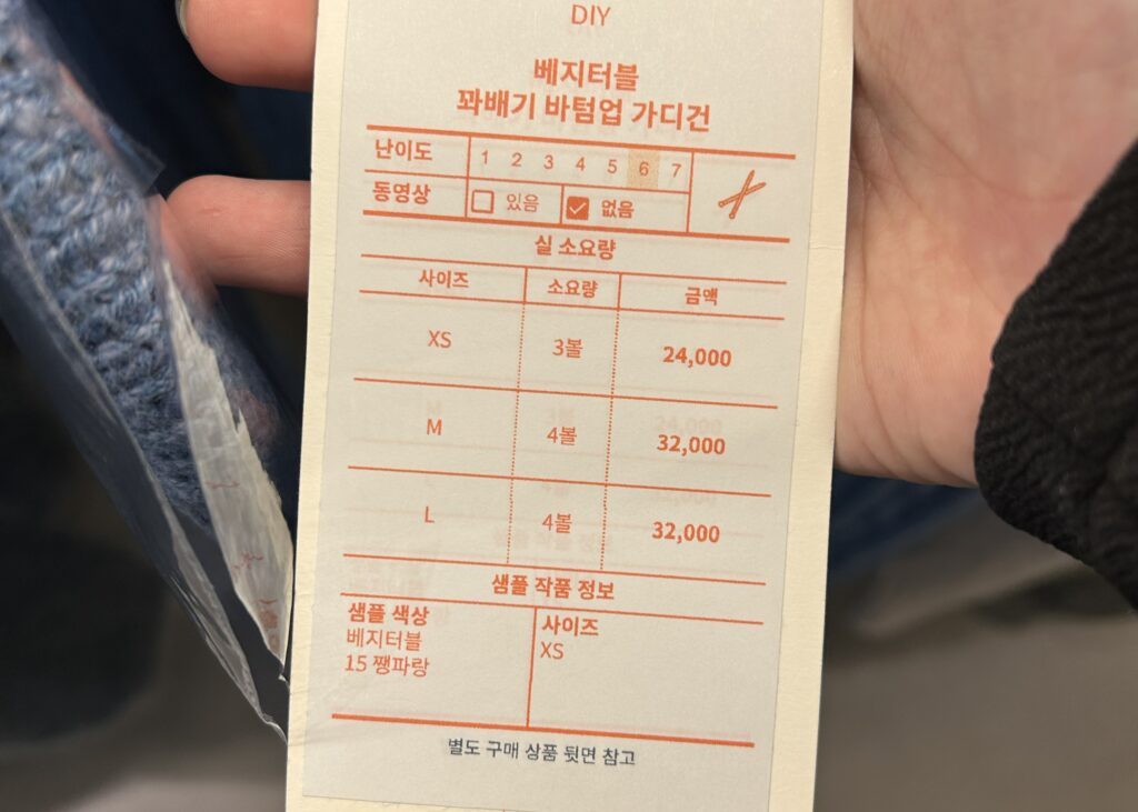 (写真の場合は、Mサイズだと指定毛糸が4つ必要で、32,000ウォンかかる、ということですね!)